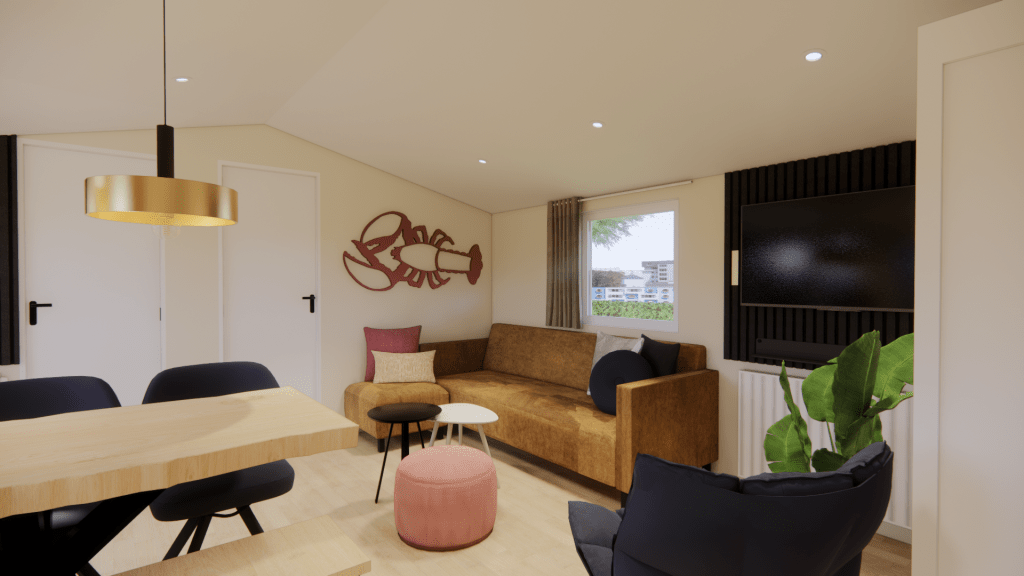 Een 3D-interieurontwerp maakt het direct zichtbaar hoe een ruimte wordt ingedeeld en welke sfeer deze krijgt. Kleuren, materialen en meubels worden realistisch weergegeven, wat ideaal is voor vakantieverblijven, horeca, zorginstellingen en shortstay-accommodaties.